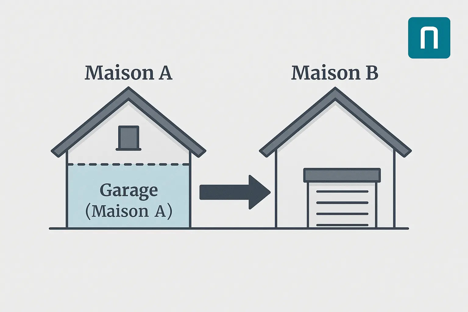 Or, dans le cas à l’étude, cette condition fait clairement défaut. Le garage concerné n’est pas une excroissance marginale ou décorative : il s’agit d’un volume fermé, construit en façade avant, qui représente une part significative de la maison A. Il est complet, autonome, et susceptible de remplir une fonction principale (stationnement, stockage, voire extension d’habitat). Il est donc impossible de le considérer comme une simple dépendance ou un accessoire au sens juridique.